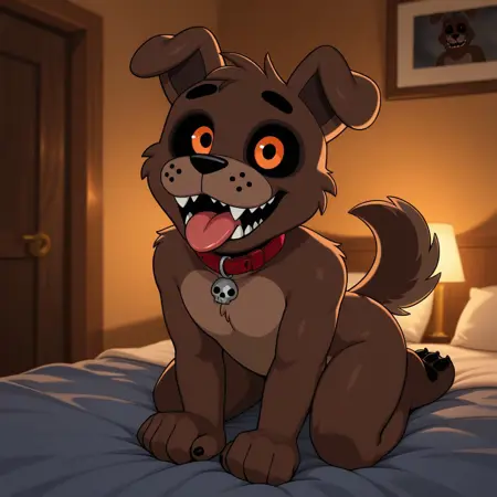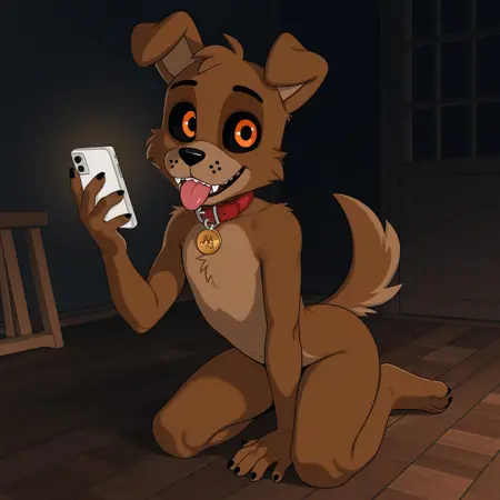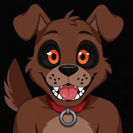 FetchFnaF,anthro,furry,dog,male,solo,Droopy ears,black sclera,Orange eyes, Brown fur, light Brown muzzle, light Brown belly,Inside of the ears light brown,red collar with Golden tag,fangs,tail