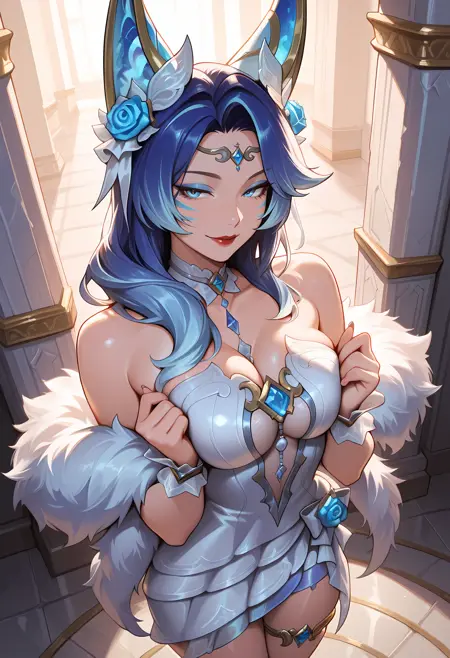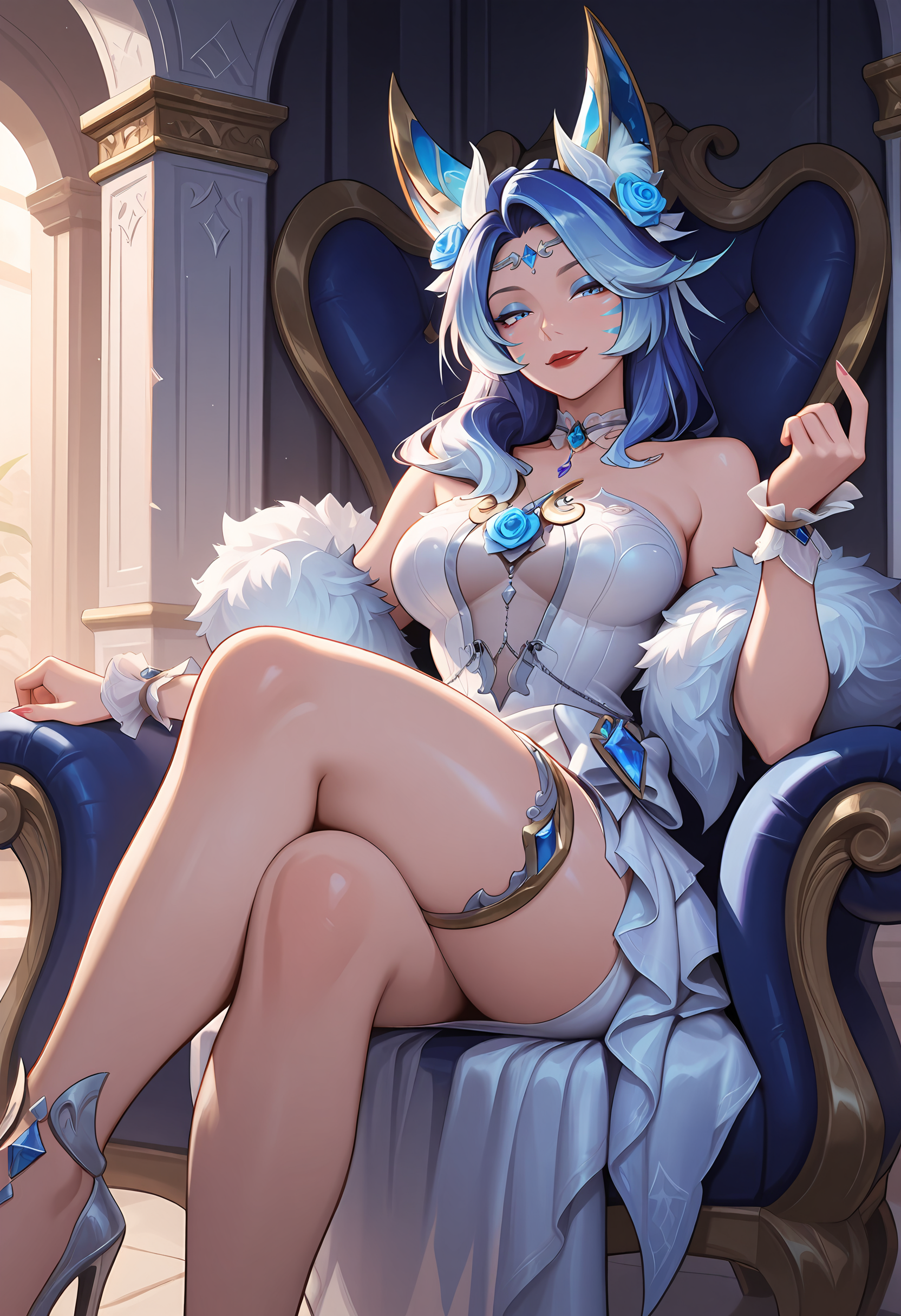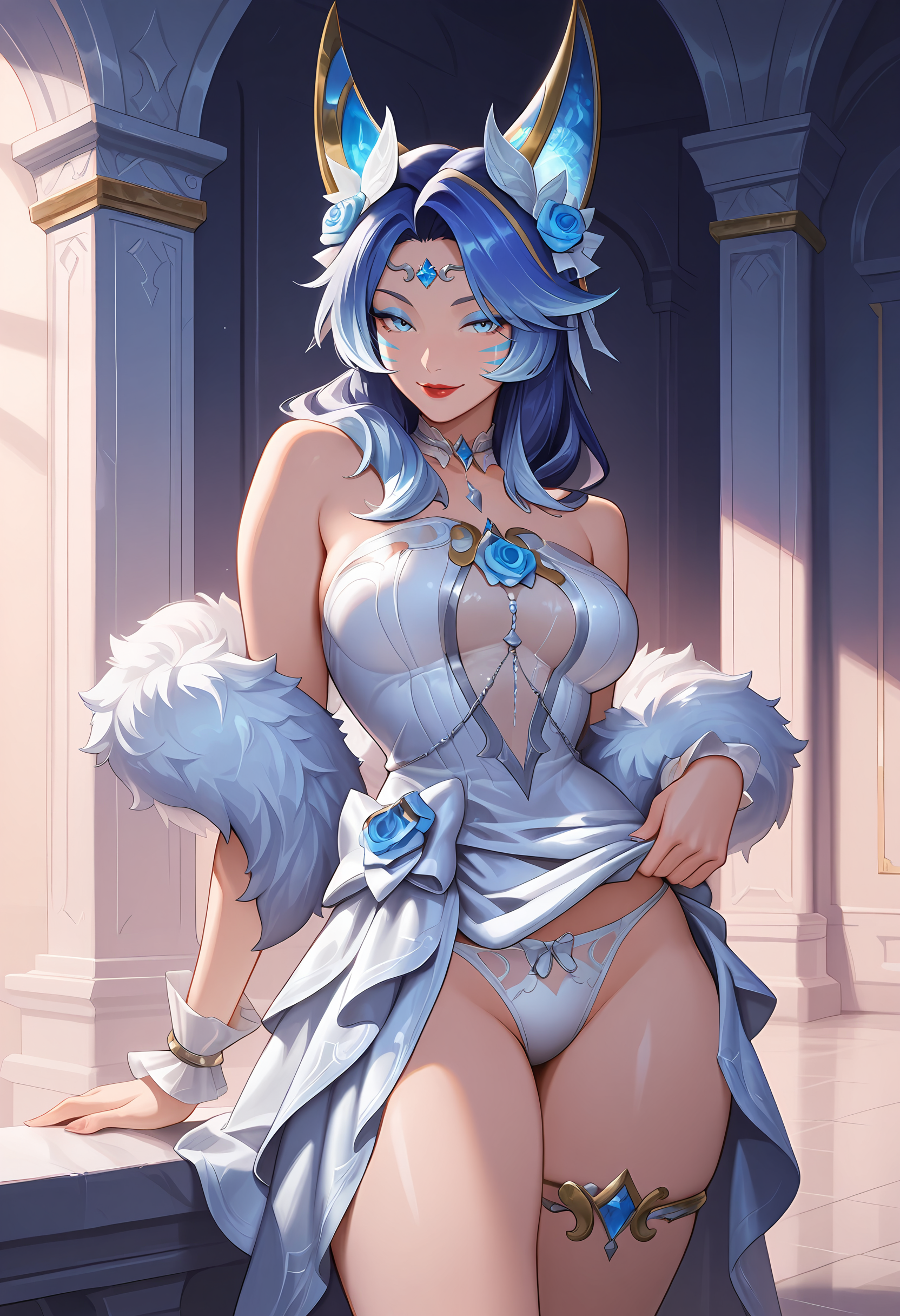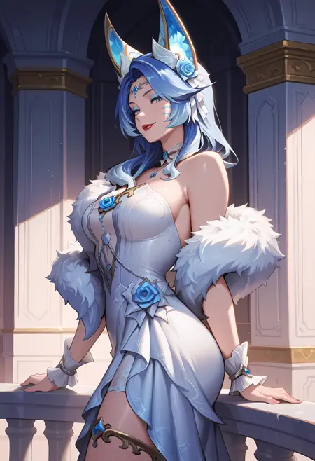 crahriil, medium breasts, long hair, parted bangs, hair ornament, fox ears, blue eyes, whisker markings, blue hair, multicolored hair, white dress, blue gemstone, bare shoulders, white feather boa, blue rose, wrist cuffs, fox girl, choker, tiara, red lips, blue eyeshadow, thighlet, crystal tail, multiple tails,
