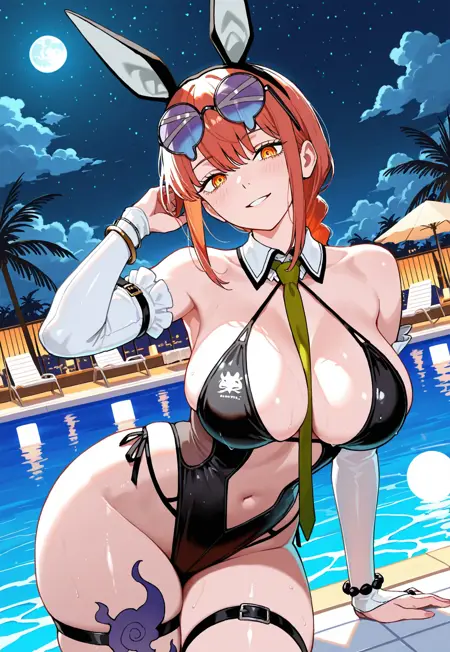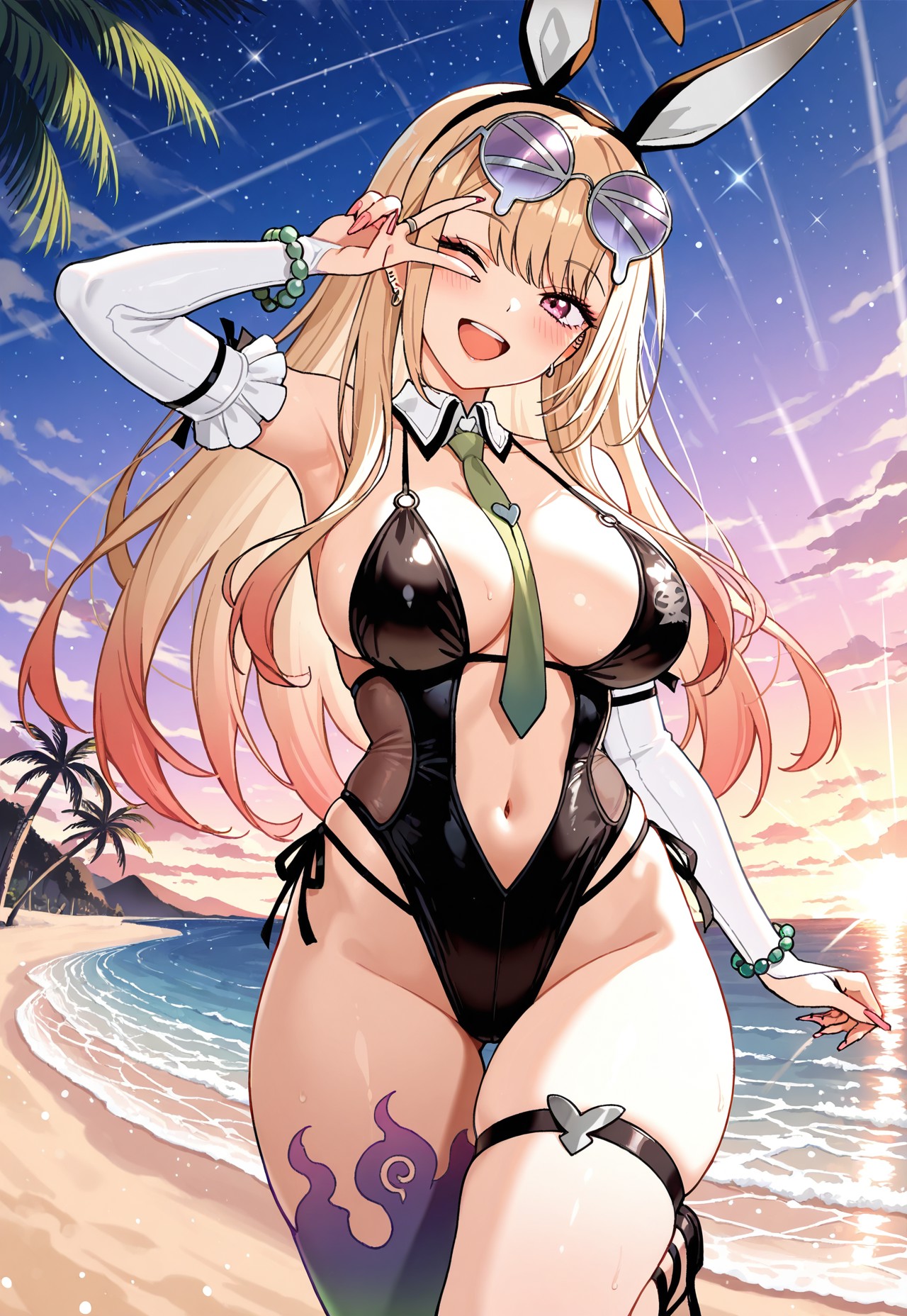 szerk,donkey ear hairband,round eyewear,eyewear on head,detached collar,green tie,white bridal gauntlets,black one-piece swimsuit,bracelet,plunging neckline,navel cutout,corruption mark,thigh strap,
