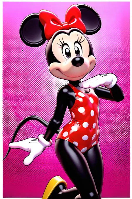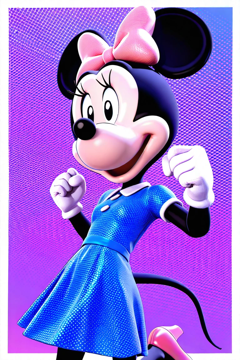 MinnieMouseJCTT, 1girl, minnie mouse, black fur, black ears, black torso, white gloves, pink head bow, pink heels, mouse tail, black eyes, blue dress, 3d