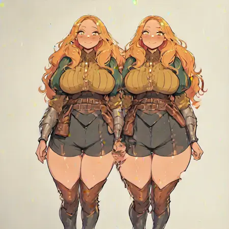 셀리나는 길고 흐르는 금색-주황색 머리카락과 황금색 눈을 가지고 있습니다. 그녀의 복장은 중세/판타지 스타일의 모험가 복장입니다: 높은 칼라와 긴 소매가 있는 금색 블라우스, 중앙에 보이는 단추와 끈 매듭, 금색 테두리가 있는 녹색 어깨 퍼프, 금색 소매, 팔뚝에 아ーム밴드, 장갑 없음, 어두운 몸에 딱 맞는 코르셋, 두 개의 갈색 가죽 끈과 파우치, 어두운 반바지, 맞춤형 바지, V자형, 허벅지까지 오는 갈색 부츠. 제가 이 부분을 정리하는 중이니 양해해 주세요. 하지만 제가 수정해야 할 사항에 조언이 있으시다면 알려주세요.