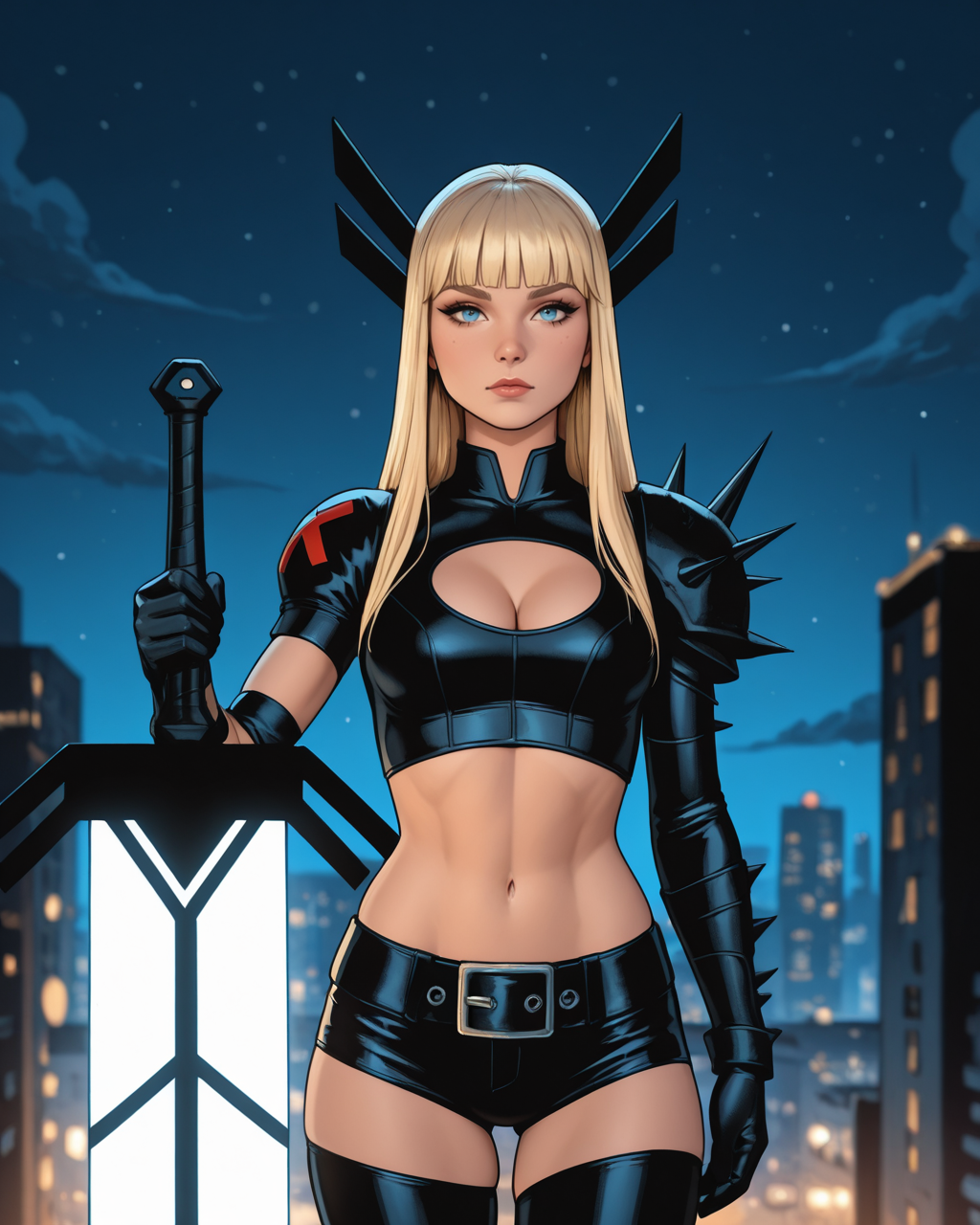 트리거: illyanamagik, uncannymagik, 긴 머리, 금발, 단정한 앞머리, 파란 눈, 머리 장신구, 날카로운 돌기, 크롭탑, 가슴 노출, 한쪽 어깨 갑옷, 한쪽 장갑, 한쪽 장갑, 복부 노출, 반바지, 짧은 반바지, 허벅지까지 오는 양말, 부츠, 거대한 검