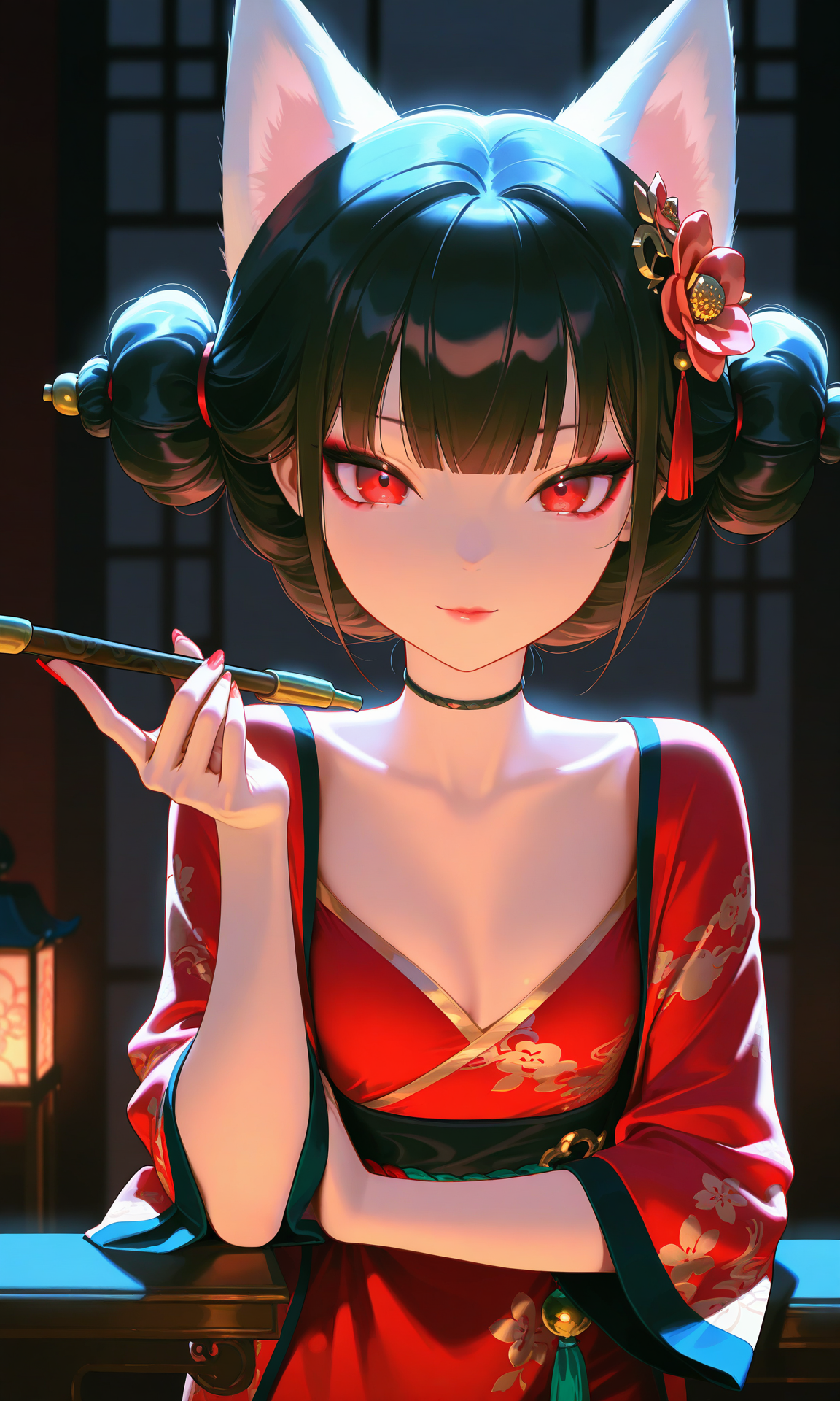 1girl, black hair, red eyes, hair ornament, red minidress, Fox Demon from white snake