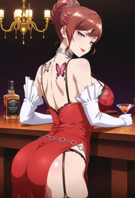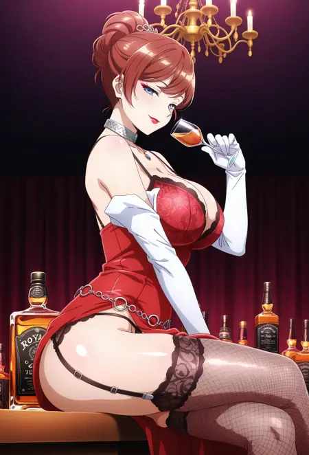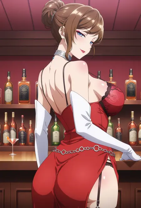 hrn_(ge), 1girl, 单人, 成熟女性, MILF, 大胸, 大屁股, 深红棕色短发, 马尾, 发髻, 蓝眼睛, 妆容, 深沟, 锁骨, 丝绸内衣, 蕾丝边, 红色连衣裙, 红唇, 银色项圈, 项链, 饰品, 红色长裙, 肘部手套, 白色手套, 吊袜带, 链条, 腰带, 侧开衩, 黑色渔网过膝袜, 黑色微型内裤, 蕾丝边内裤,