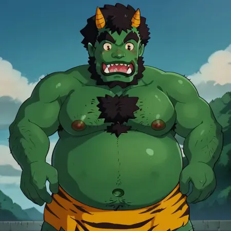 ◇鬼、赤鬼、緑鬼、虎柄の褌、太り気味、体毛、胸、胸毛、大きな垂れた乳房、大きな乳首、乳首の毛、大きなへそ、へその毛、黒いひげ、髪、短髪、角、二本の角、