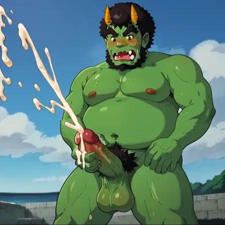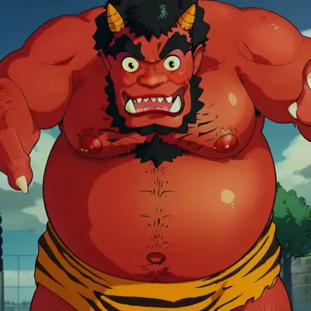 ◇鬼,赤鬼,绿鬼,虎纹腰布,肥胖,体毛,胸部,胸毛,下垂的大乳房,大乳头,乳头毛,大肚脐,脐毛,黑胡须,头发,短发,角,两只角,
