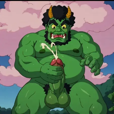 ◇鬼,赤鬼,绿鬼,虎纹腰布,肥胖,体毛,胸部,胸毛,下垂的大乳房,大乳头,乳头毛,大肚脐,脐毛,黑胡须,头发,短发,角,两只角,