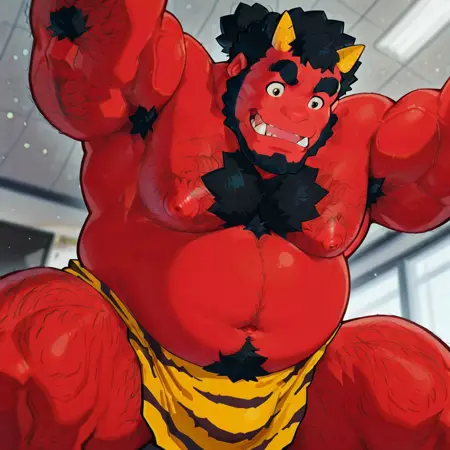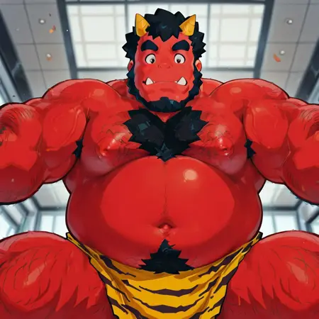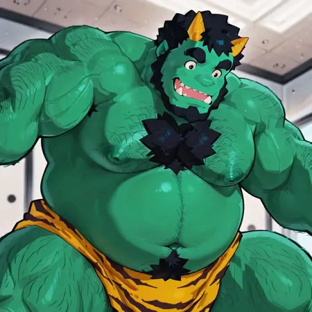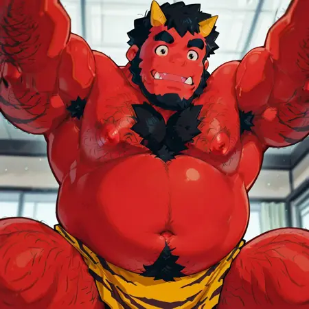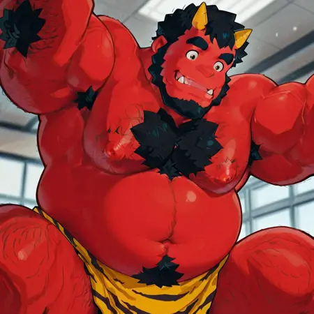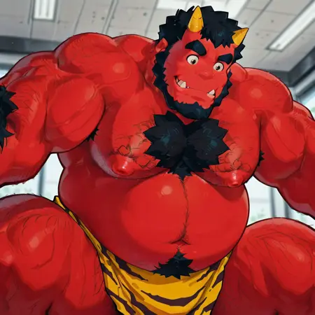◇鬼,赤鬼,绿鬼,虎纹腰布,肥胖,体毛,胸部,胸毛,下垂的大乳房,大乳头,乳头毛,大肚脐,脐毛,黑胡须,头发,短发,角,两只角,