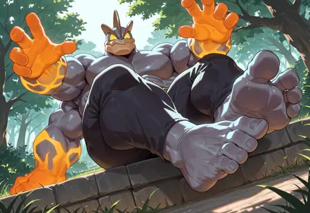 1boy, solo, GMachamp, Pokemon, close up, smirk, orange hands, (((5 fingers, 4 arms, 4 hands, 2 toes, grey toes, massive feet))), yellow sclera, black pants, glowing sclera, no pupils, wide body, huge body, massive muscles