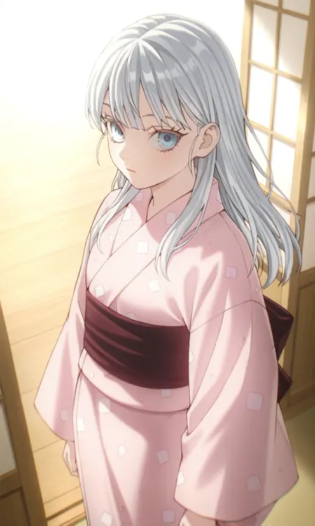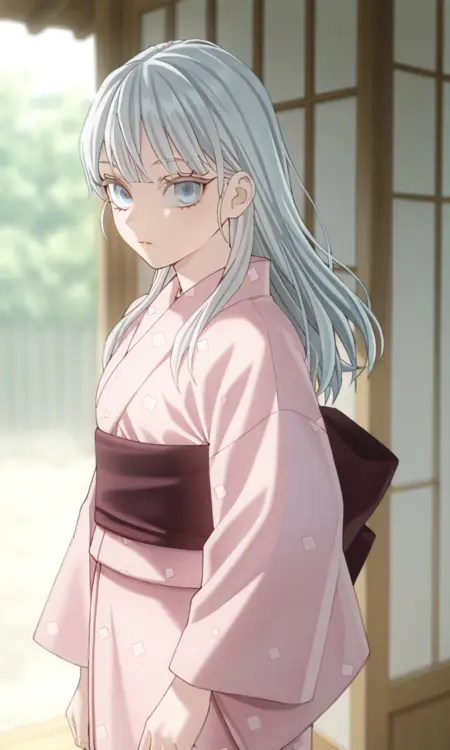 梅,1个女孩,单独,银发,蓝眼,睫毛,长发,刘海,日本服饰,粉色和服,长袖,腰带,