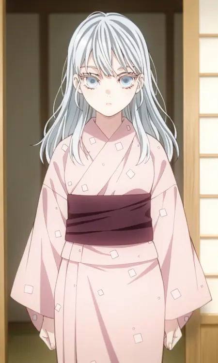 Ume,1girl,solo,Silver Hair,blue eyes,eyelashes,long hair,bangs,japanese clothes, pink kimono,long sleeves,obi,