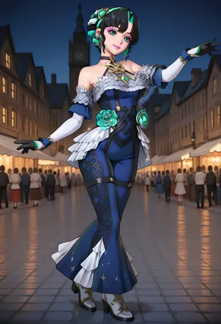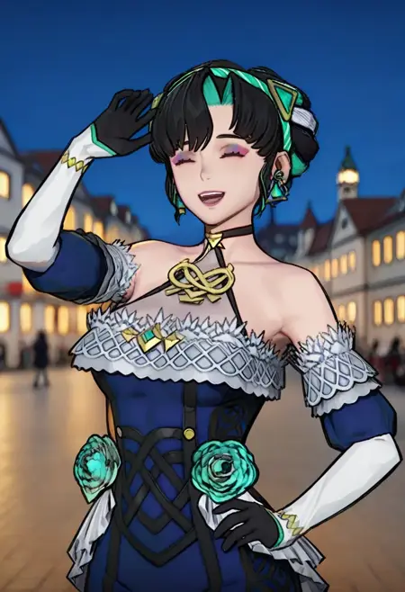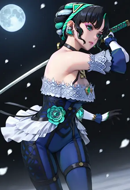 衣装タグ: 肩出し、ハーネック、ボディスーツ、黒手袋、取り外し可能な袖、フリル、緑の薔薇、チョーカー