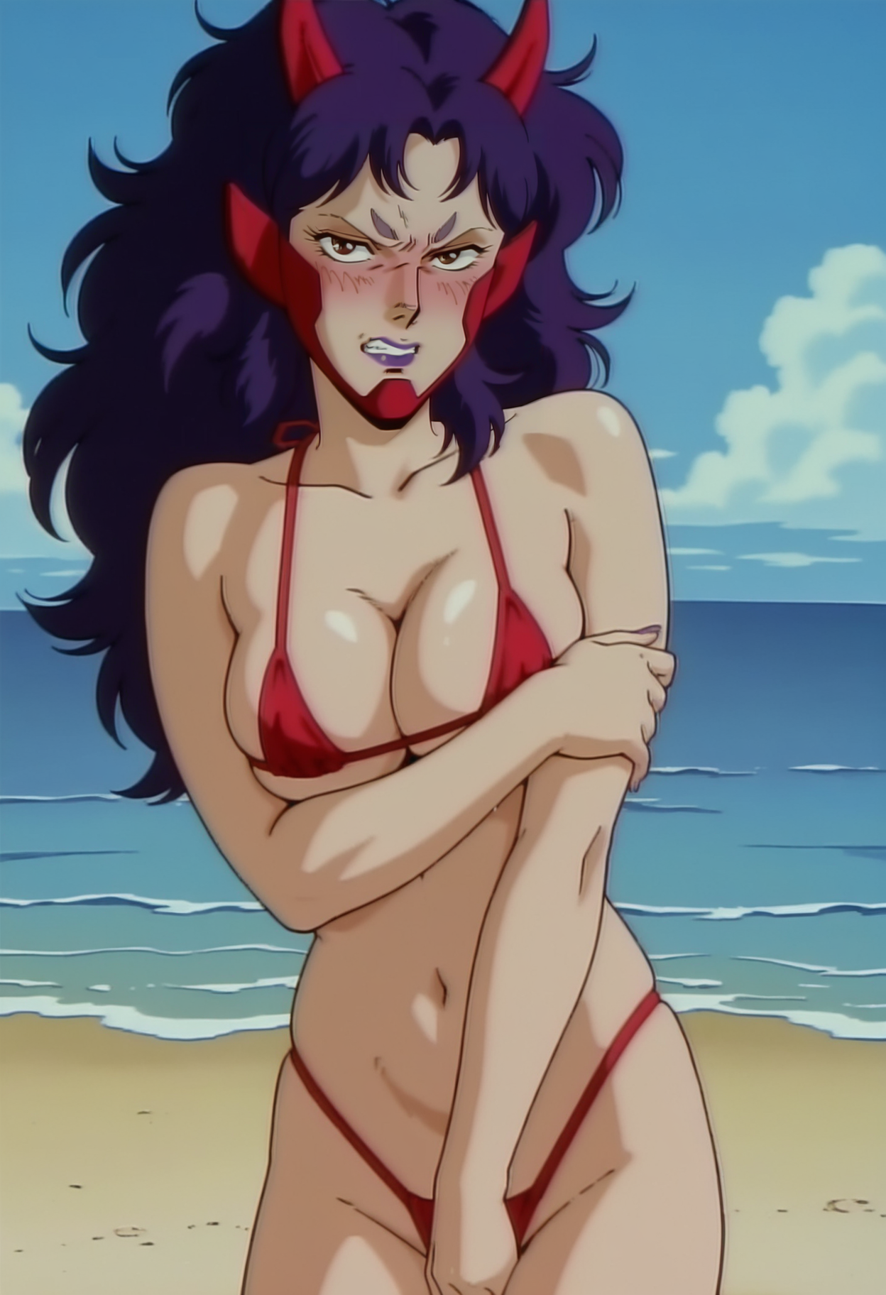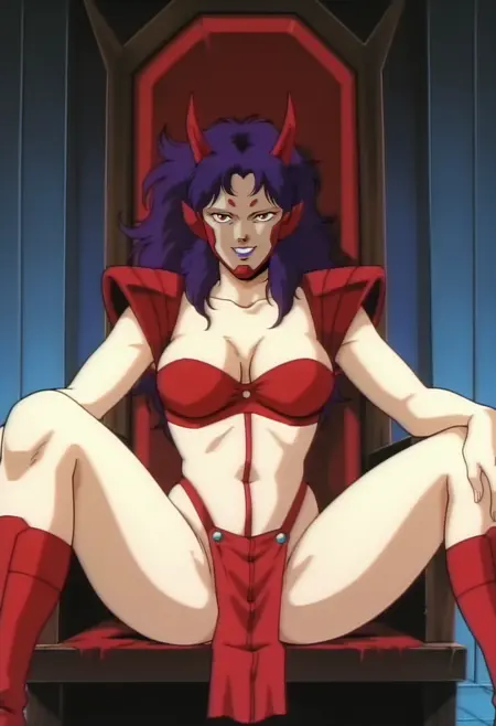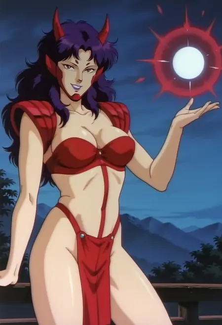 mm,mature female,purple hair,long hair,horns,purple lips,brown eyes,anime coloring,retro artstyle