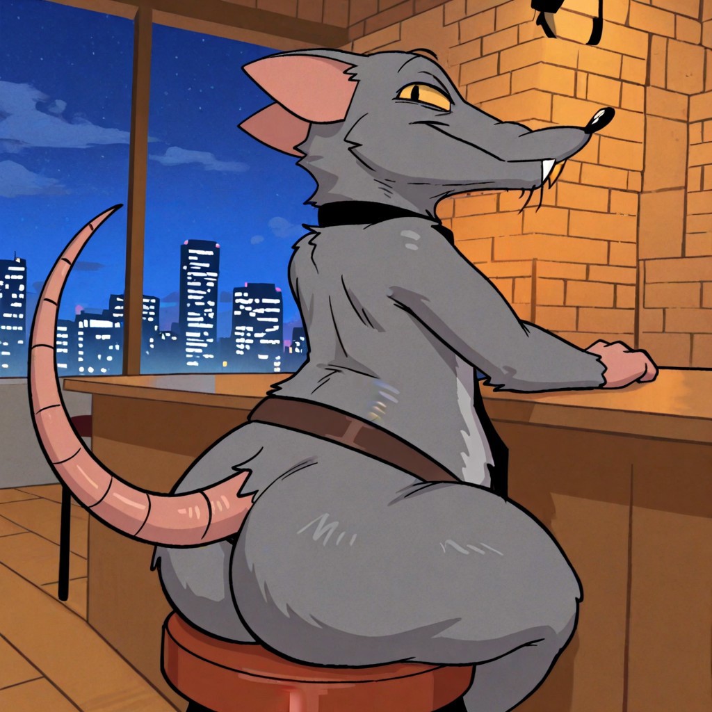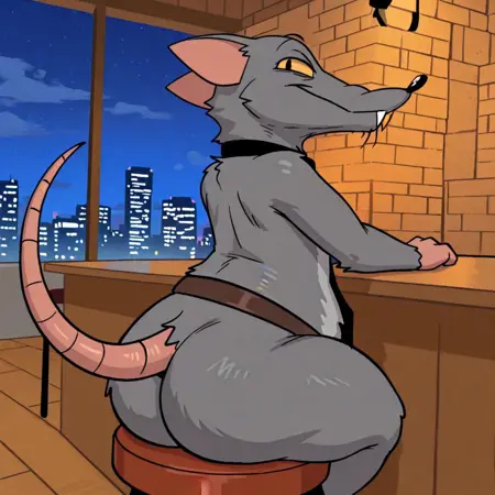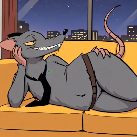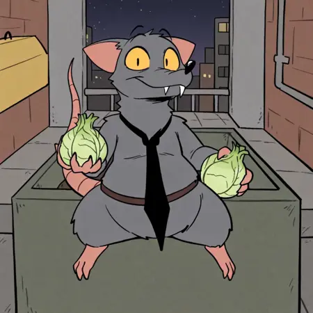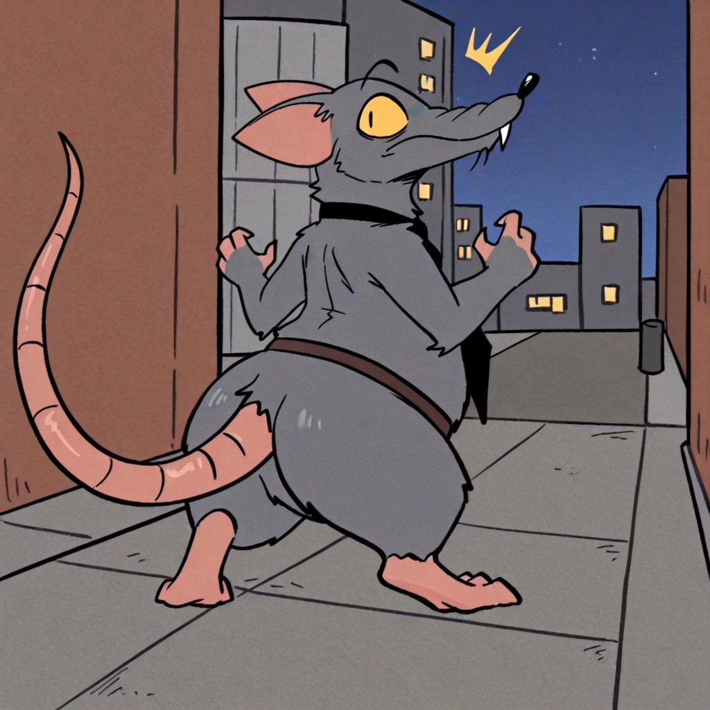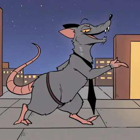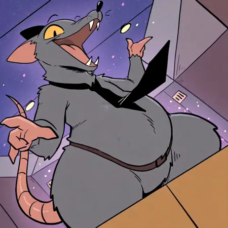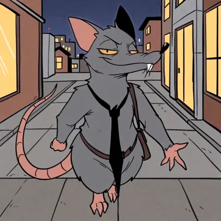 TitoRat, rat, grey fur, black eyes, yellow sclera, pink tail, Black nose, black necktie, brown belt