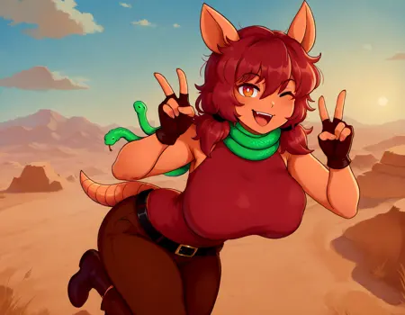 1girl, solo, red hair, medium, low twintails, hair between eyes, messy hair, animal ears, armadillo ears, armadillo tail, orange eyes, fingerless gloves, snake scarf, shell
