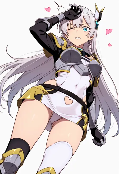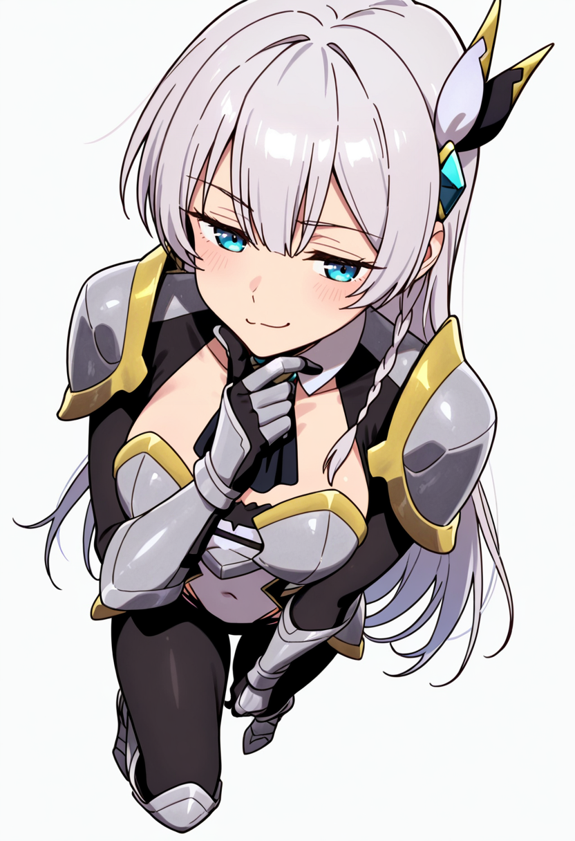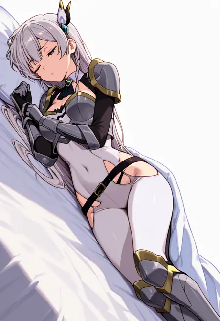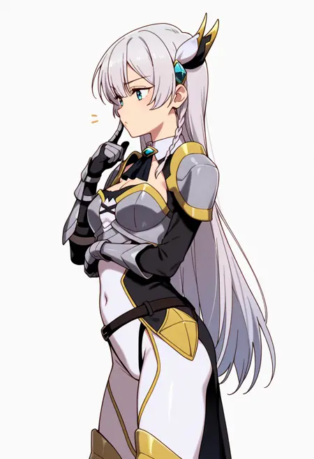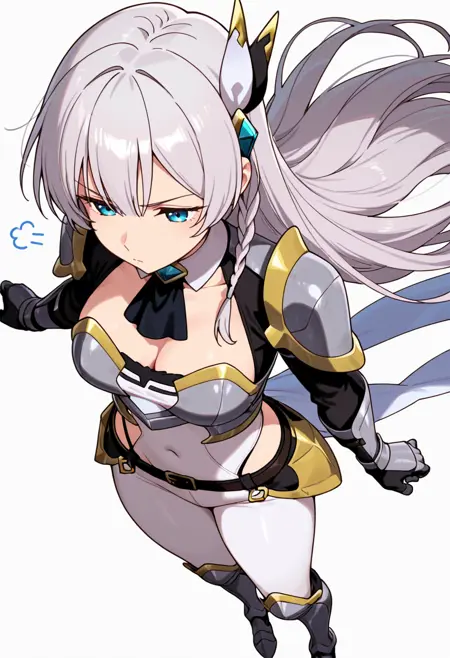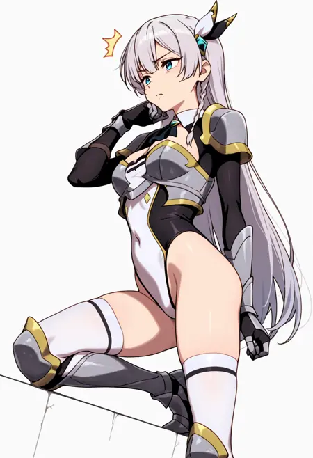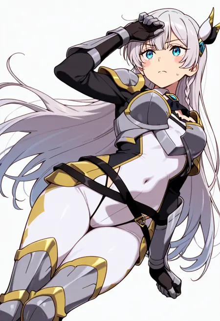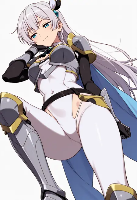 armor, pauldrons, covered navel, breastplate, ascot, white bodysuit, gauntlets, highleg panties under clothes, waist cutout, armored boots, belt,