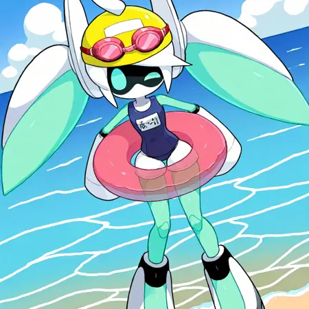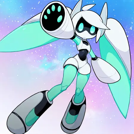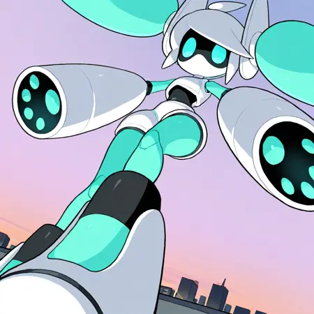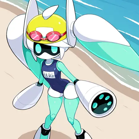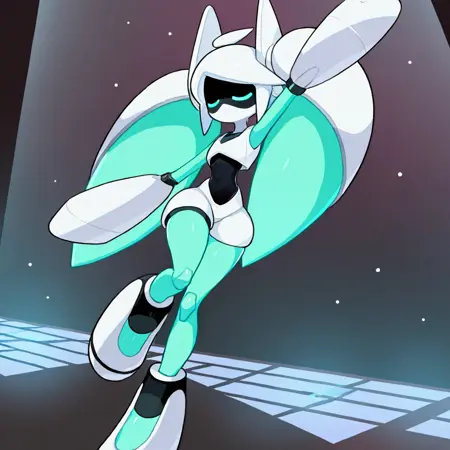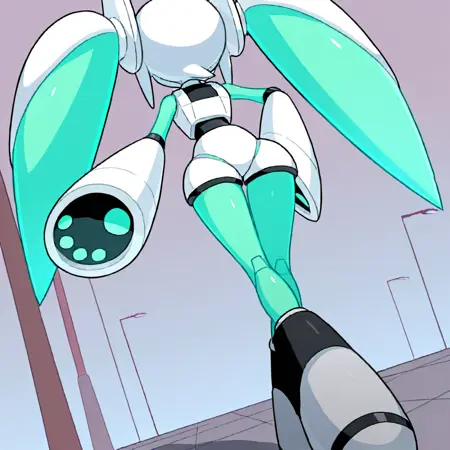 robot, humanoid, female, twintails, screen face, screen eyes, light blue eyes, light blue skin, arm cannon, footwear, white shorts, black leotard under clothes,