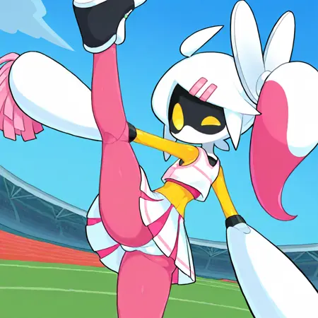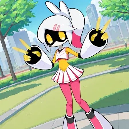 robot, humanoid, female, cheerleader skin, ponytail, screen face, screen eyes, yellow eyes, white face, multicolored body, yellow torso, yellow arms, pink legs, white arm cannon, hairclip, footwear, white hair, (pink hair tip), pink crop top, midriff, white skirt,