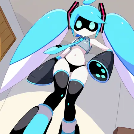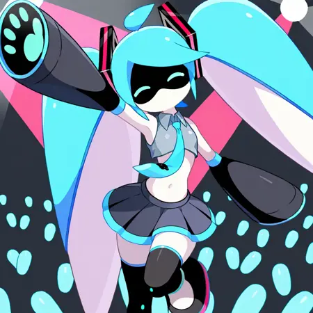robot, humanoid, female, miku skin, twintails, screen face, screen eyes, light blue eyes, white skin, arm cannon, footwear, grey cropped shirt, necktie, midriff, skirt, black thighhighs, hair ornament,