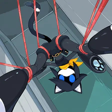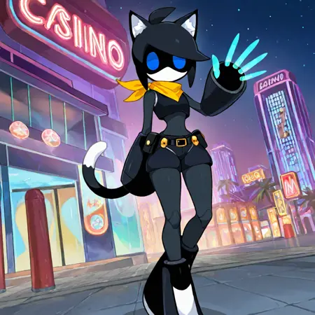 robot, humanoid, female, morgana skin, cat ears, cat tail, screen face, screen eyes, blue eyes, black skin, bandana around neck, black footwear, black crop top, midriff, black shorts, belt pouch, belt,