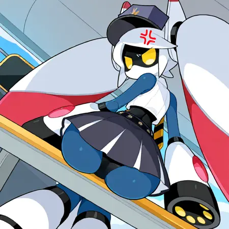 robot, humanoid, female, police skin, twintails, screen face, screen eyes, yellow eyes, navy blue skin, arm cannon, footwear, white cropped shirt, stripped neck tie, belted skirt, hat, black leotard under clothes, white hair, red hair tips,