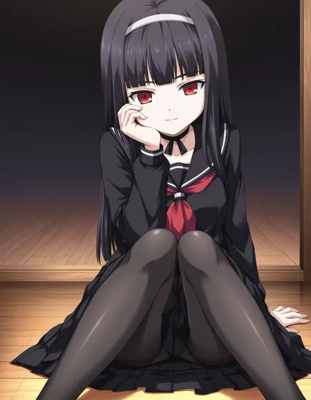 minazuki ajisai, black hair, long hair, blunt bangs, hairband, red eyes, ribbon choker, black serafuku, red neckerchief, long skirt, black pantyhose