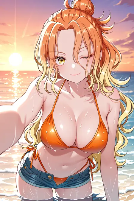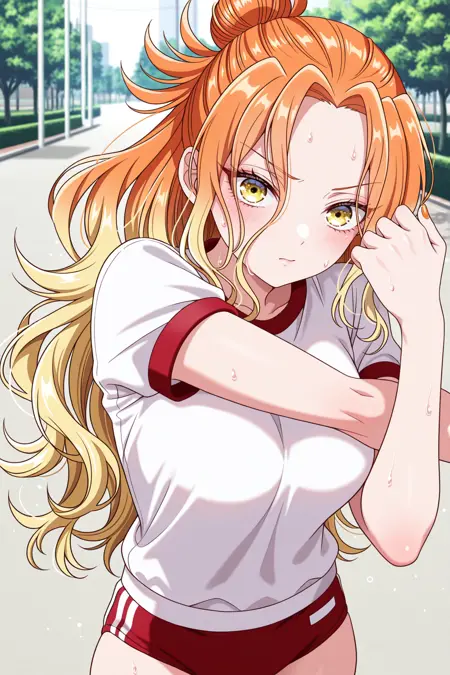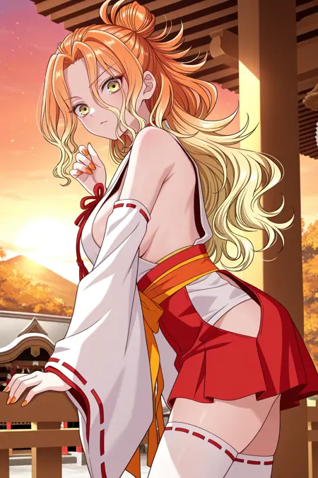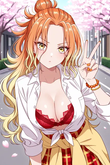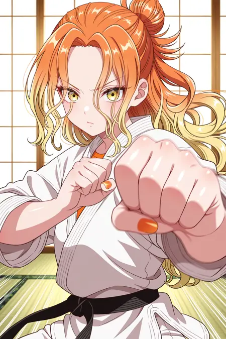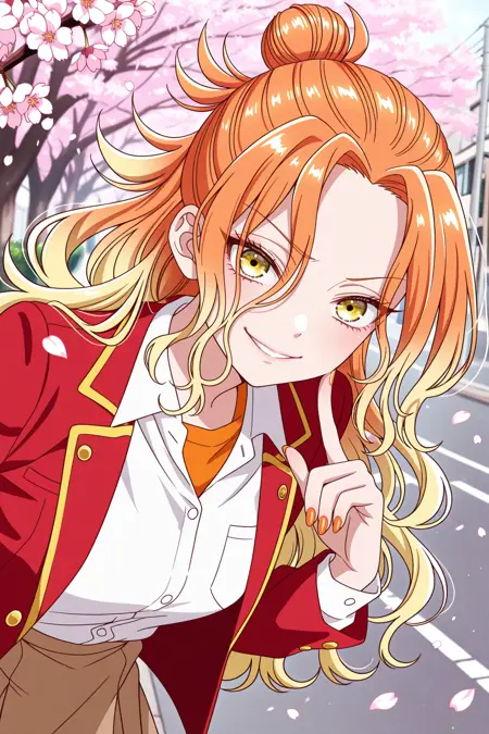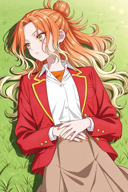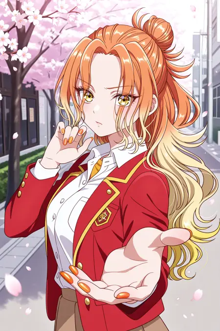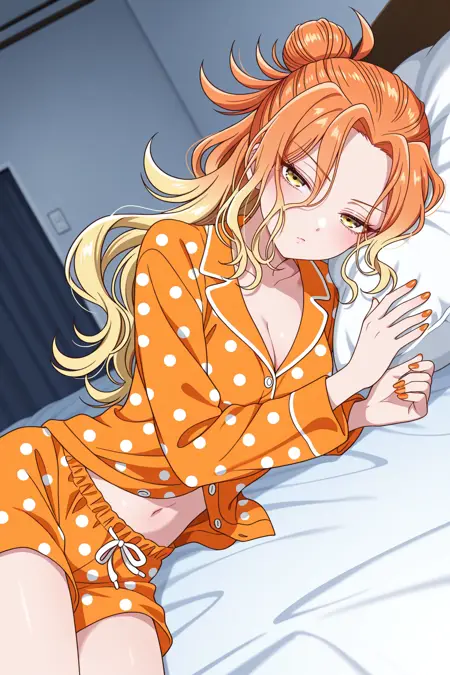 mikadono niko, 오렌지색 머리, 노란색 눈, 긴 머리, 그라데이션 머리, 반올림 머리묶음, 곱슬머리, 속눈썹, 앞머리, 오렌지색 손톱, 네일 폴리시
