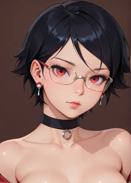saradaxd, 1girl, short hair, glasses, black hair, earrings, choker, jewelry, black eyes, black choker, lips,