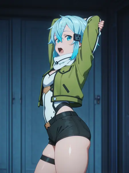 시논 GGO: 시논궁알레, 1소녀, 단독, 파란 눈, 손가락 없는 장갑, 헤어클립 스카프, 짧은 반바지, 단발, 머리 장식, 헤어클립, 검은 반바지, 파란 머리, 검은 장갑, 녹색 재킷, 녹색 바지 허벅지 스트랩, 바지, 흰 스카프 오픈 재킷, 레오타드