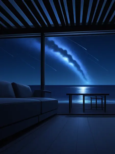 タグ: nightsofa, sky, night, scenery, night sky, couch, ocean, starry sky, horizon, blue theme, shooting star,