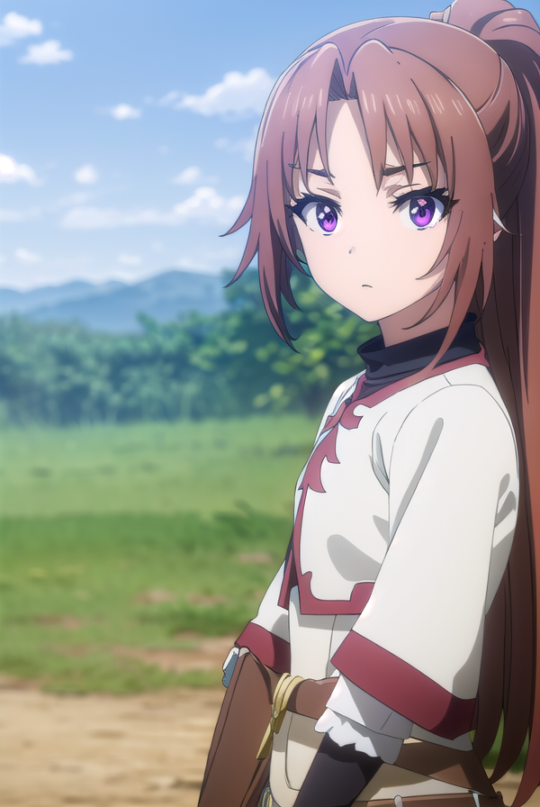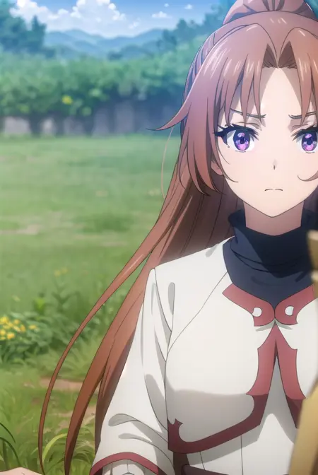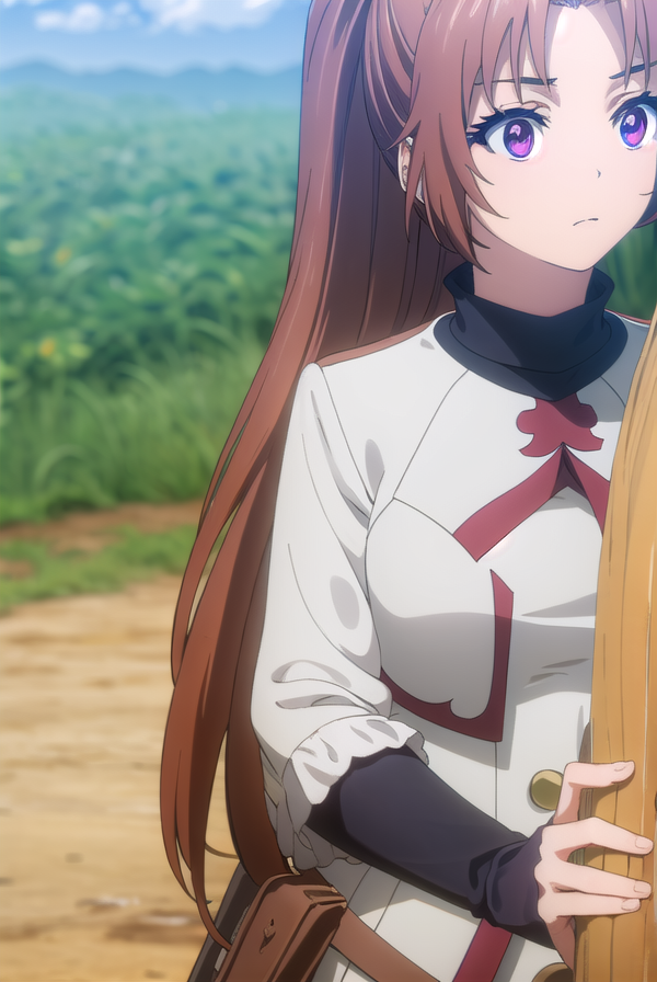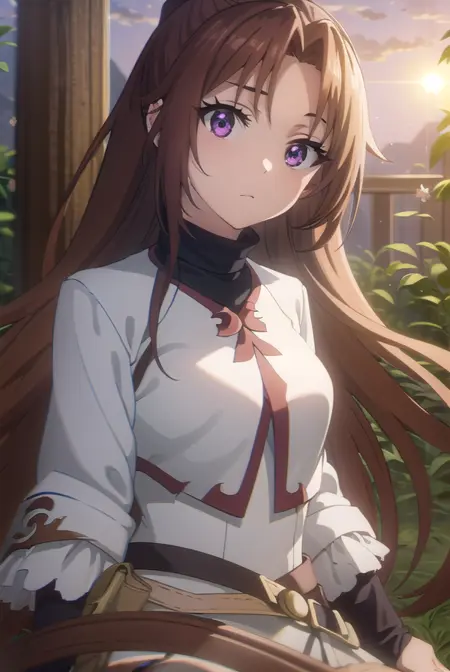 见习牧师,长发,棕色头发,(紫色眼睛:1.1),马尾辫,分刘海,