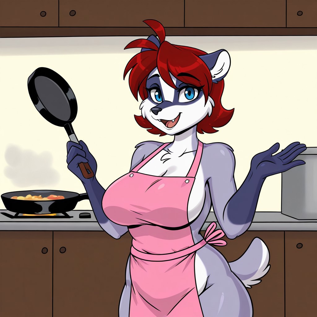 kelly_uq, raccoon_girl, blue eyes, 1girl, solo, furry, furry female, red hair, tail, long/short hair, breasts, mature female, animal nose, animal ears, snout, two tone fur, body fur,
