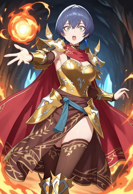 尤诺:中分刘海,低马尾,短马尾,银色耳环,白色肩甲,棕色过膝袜,金色胸甲,金色臂甲,棕色裹裙,红色斗篷,棕色肘套,金色装甲靴,金色护腹,腰带,高跟靴,黑色短裤