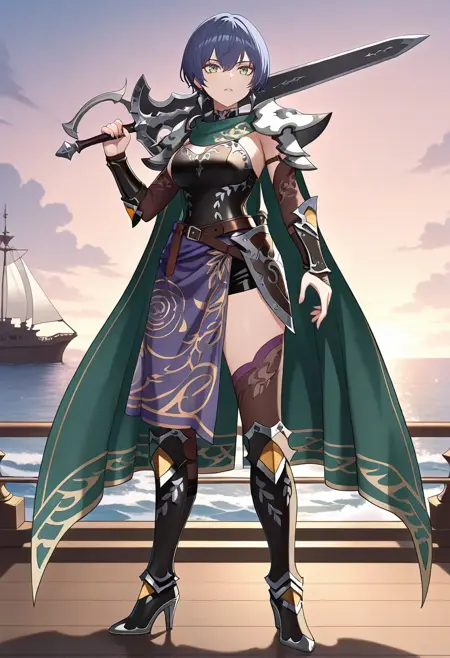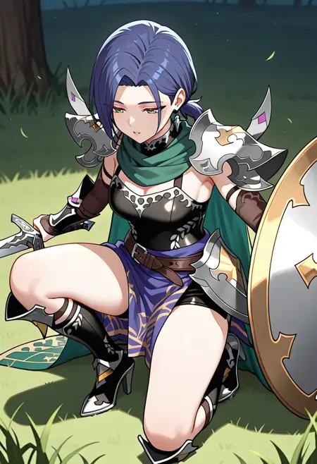 오로라: 중간 갈라진 앞머리, 낮은 포니테일, 짧은 포니테일, 은 귀걸이, 은 어깨갑옷, 검은 허벅지양말, 검은 가슴갑옷, 검은 팔보호대, 보라색 사롱, 초록색 망토, 검은 팔꿈치장갑, 검은 갑옷부츠, 검은 허리보호대, 벨트, 하이힐 부츠, 검은 단축바지