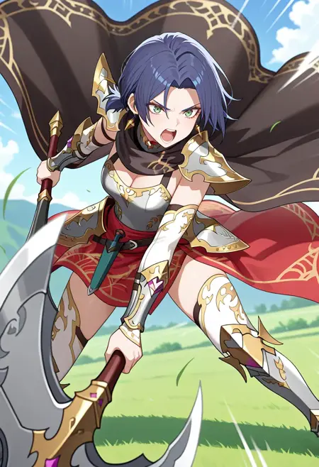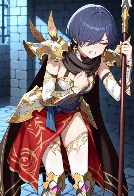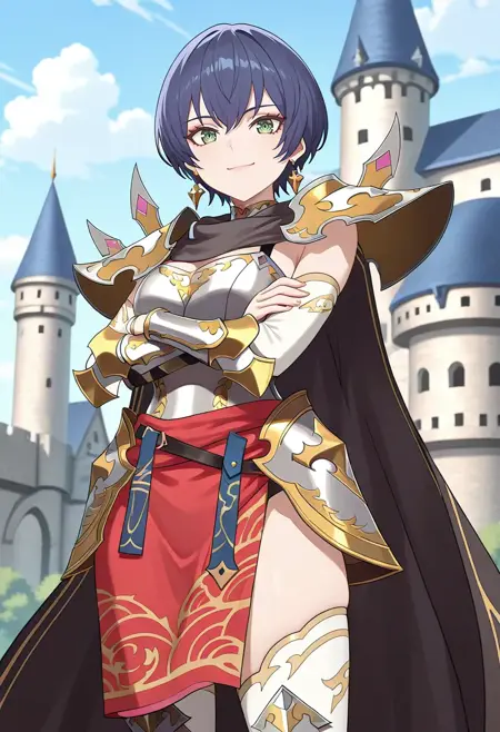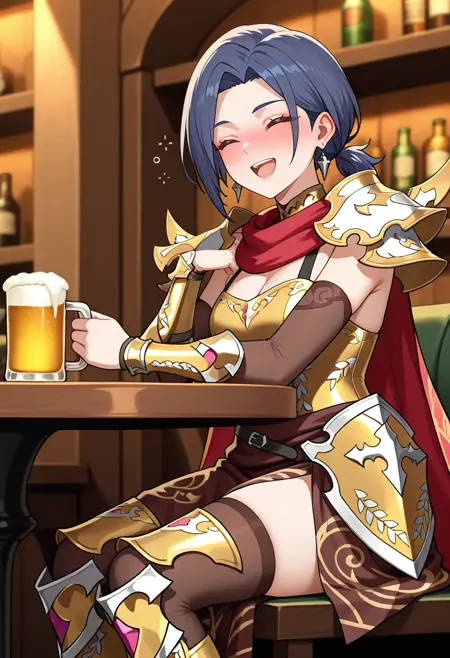 유노: 중간 갈라진 앞머리, 낮은 포니테일, 짧은 포니테일, 은 귀걸이, 흰 어깨갑옷, 갈색 허벅지양말, 금 가슴갑옷, 금 팔보호대, 갈색 사롱, 빨간 망토, 갈색 팔꿈치장갑, 금 갑옷부츠, 금 허리보호대, 벨트, 하이힐 부츠, 검은 단축바지