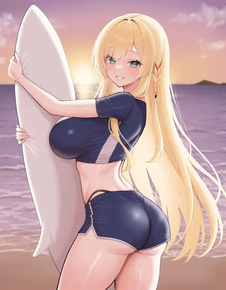 AzlaKongouSwim, 1girl,蓝眼,金发,长发,发辫,防晒衣,海豚短裤,