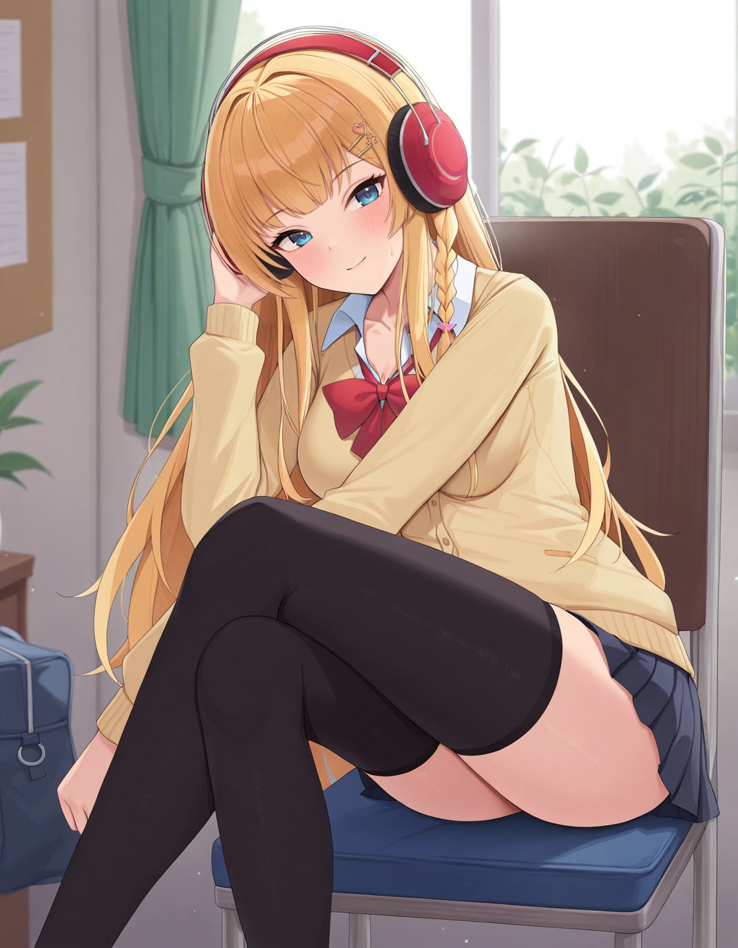AzlaKongouSchool, 1girl,蓝眼,金发,长发,发辫,红色耳机,校服,发饰,红色蝴蝶结,黑色过膝袜,百褶裙,开衫,
