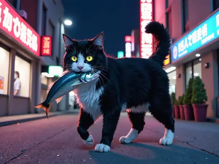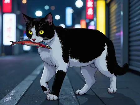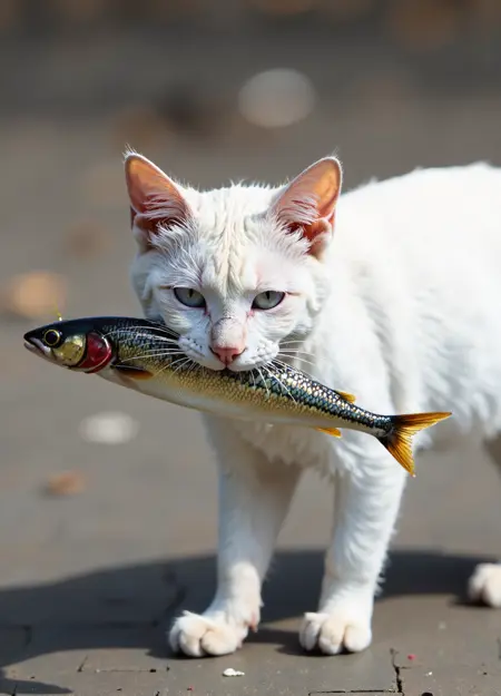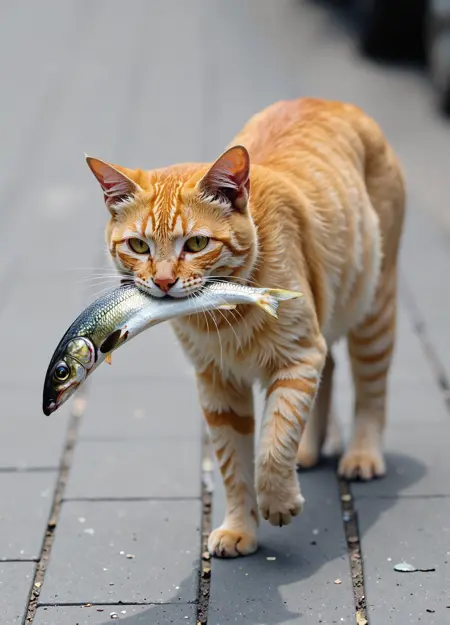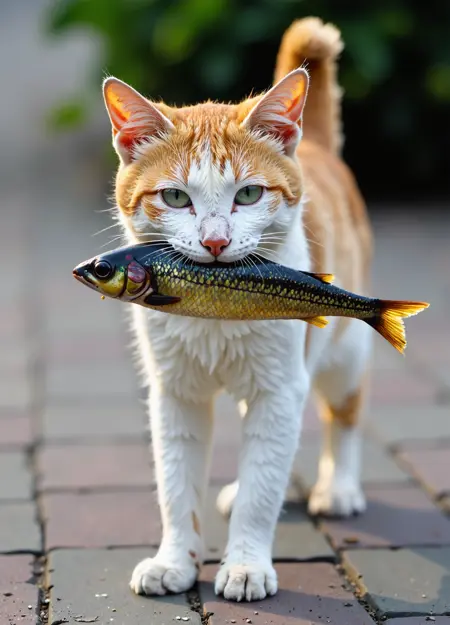 The FLUX base model already has a general understanding of a cat with a fish in its mouth, which makes the training relatively easy,but the fish's position is slightly off. The key is to reinforce the fish's placement in the cat's mouth. The training dataset is small, with only 18 images