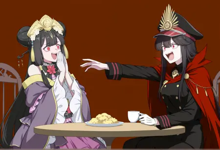非常长的头发、黑发、双髻、低双马尾、红眼睛、发饰、中国发簪、颈带、颈花、褶边、长袖、宽袖、露肩、