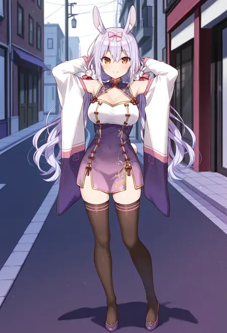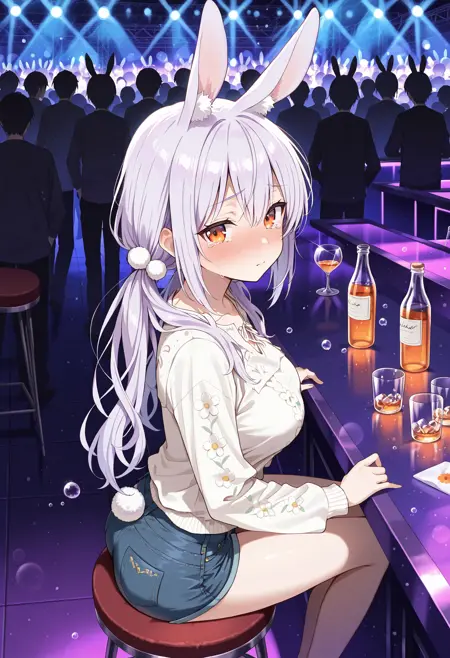 트리거 단어: 1girl, 중간 크기의 가슴, 연한 보라색 머리카락, 긴 머리, 긴 쌍꼬리, 주황색 눈, 연한 보라색 토끼 귀, 토끼 귀, 흰색 토끼 꼬리,