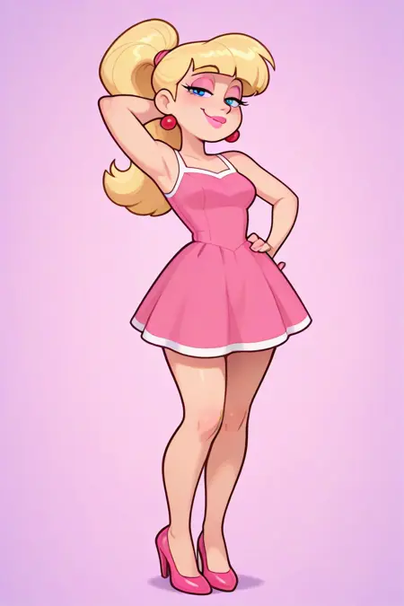 fair light skin, long blonde hair, high voluminous ponytail, fringe bangs, spherical red earrings, lavender eye shadow, blue eyes, glossy lips, pink rosy lips, slender build, long graceful neck, vibrant pink sleeveless knee-length dress with white trim and flared skirt, pink high heels, style parody