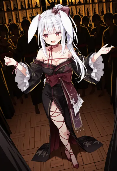 트리거 단어: 1girl, 긴 머리, 머리묶음, 높은 포니테일, 흰 머리, 흰 토끼 귀, 빨간 눈, 중간 크기 가슴, 흰 토끼 꼬리,