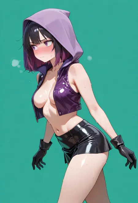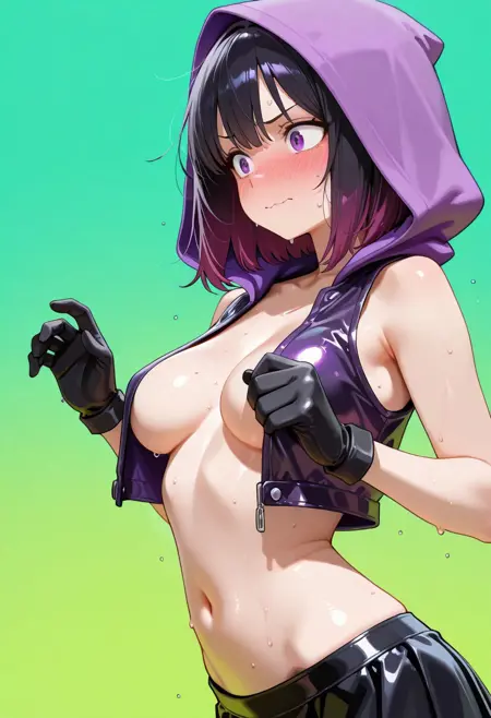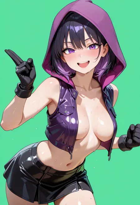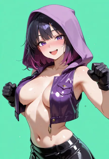 | トレーニングワード | Rana(thief despite herself)コピーしました! (girl clothes :((vest on breasts, full open vest, purple vest, sleeveless leather vest), nude under vest, purple hood, navel, black up mini-skirt, collarbone, black gloves),コピーしました! 1girl, classic medium hair, black hair dyed purple hair ends, purple eyes, medium breastsコピーしました! |
