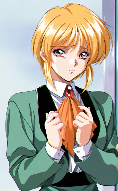 standard outfit, white shirt, long sleeves, red bow, purple pencil skirt, hand bag