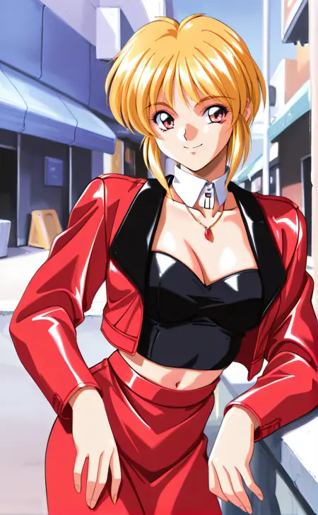 necklace, white detached collar, black top, collarbone, red sleeves, jacket, midriff, red skirt