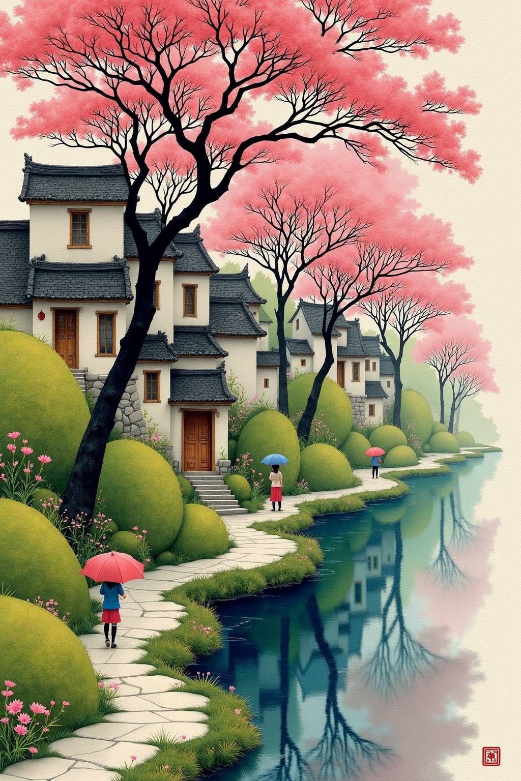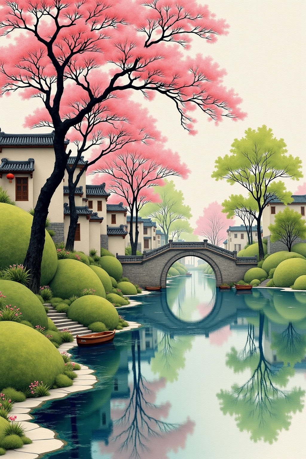 基本プロンプト: 川とピンクの木のある中国風風景