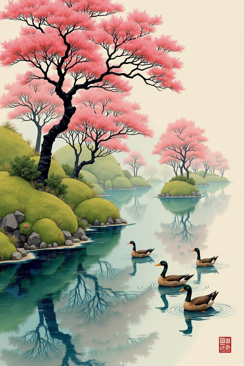 川とピンクの木のある中国風風景、野生のアヒルの群れが泳ぎ、水面に波紋が広がり、自然の生命力。