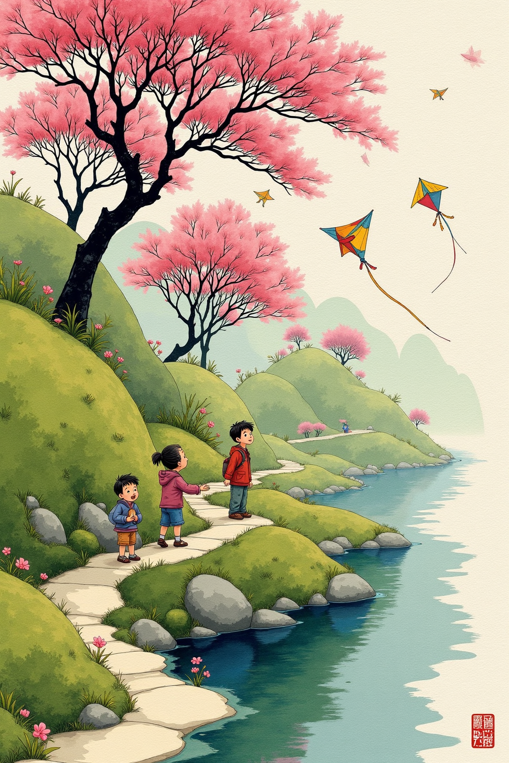 川とピンクの木のある中国風風景、丘の上で子どもたちが凧を上げ、笑い声が響き渡る、活気に満ちた春の雰囲気。