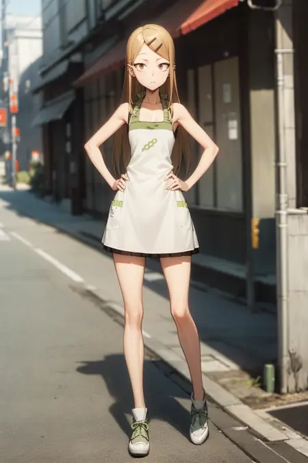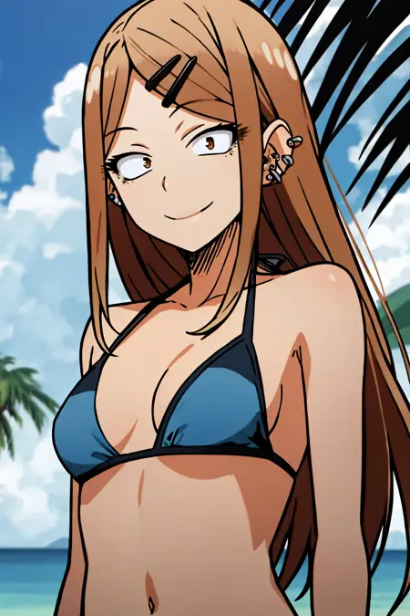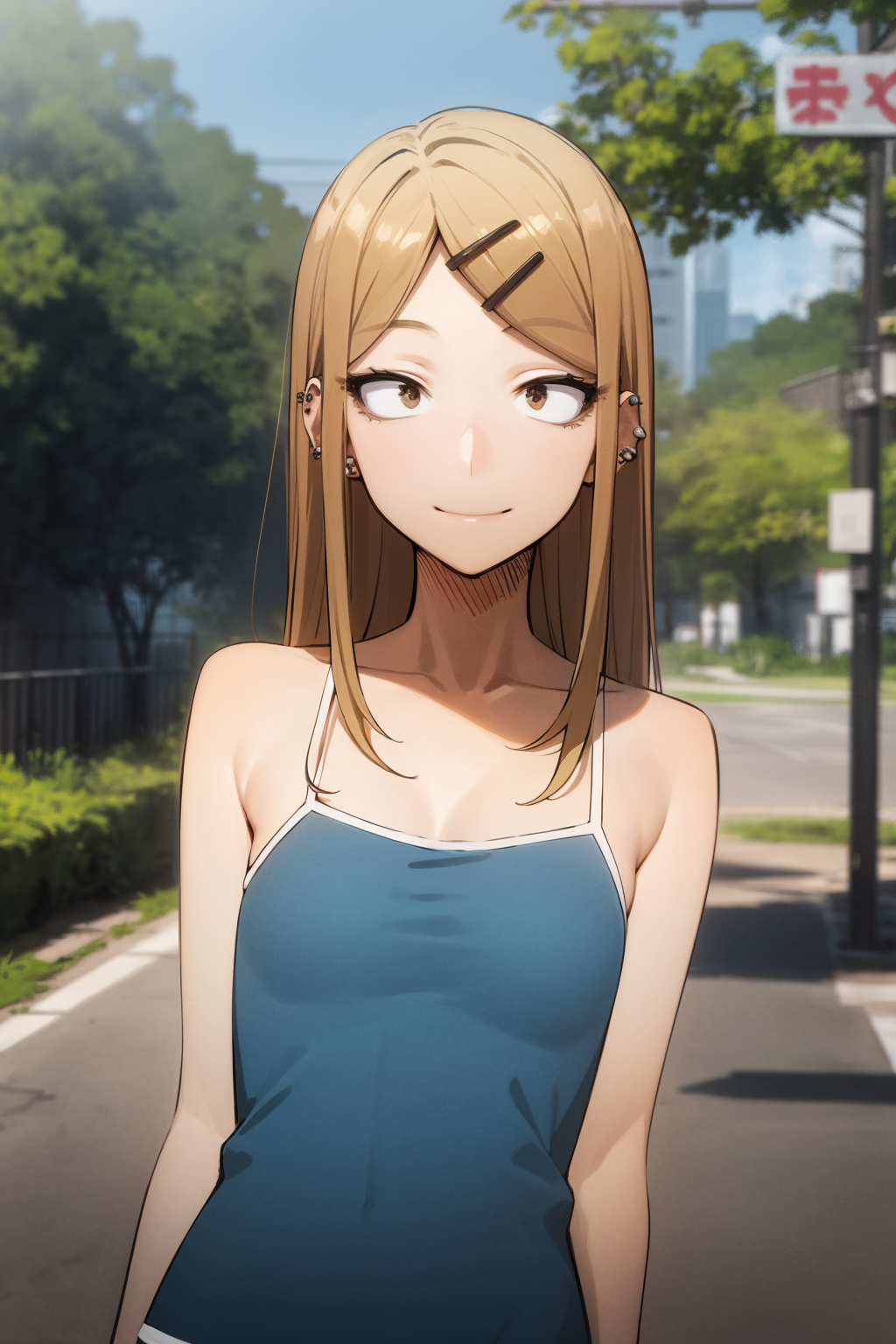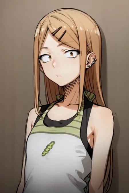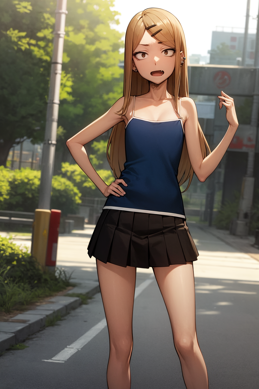 基础提示词:棕色眼睛,金色头发,长发,发夹,耳钉,三白眼,张嘴,虎牙