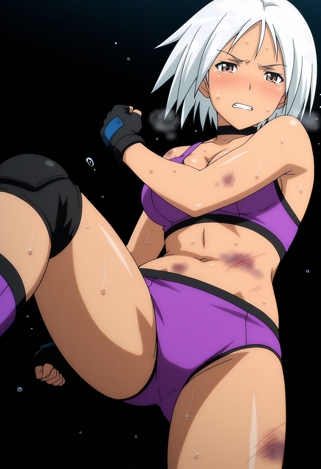 cleavage, navel, fingerless gloves, black gloves, sports bra, purple wrestling outfit, black choker, knee pads, boots